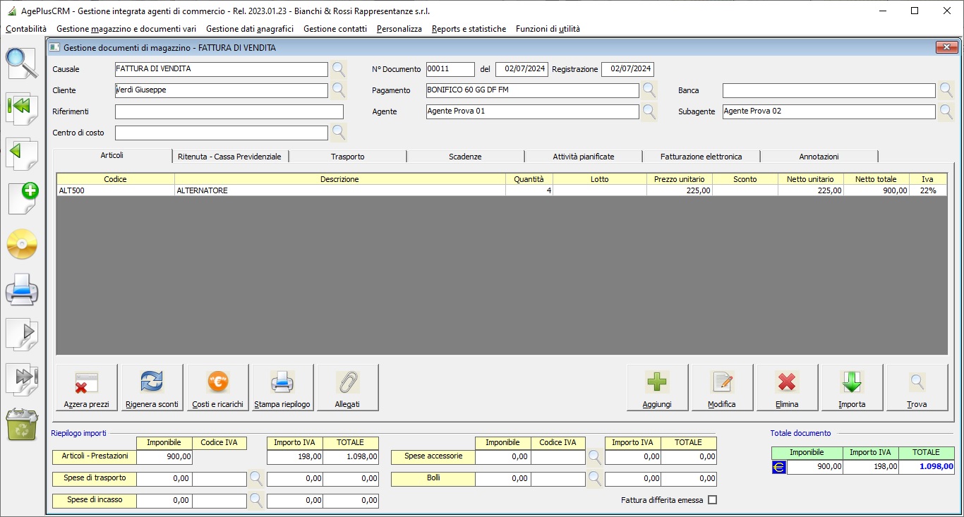 - Gestione documenti fiscali emessi da fornitori a clienti con gestione scadenze e liquidazione provvigioni